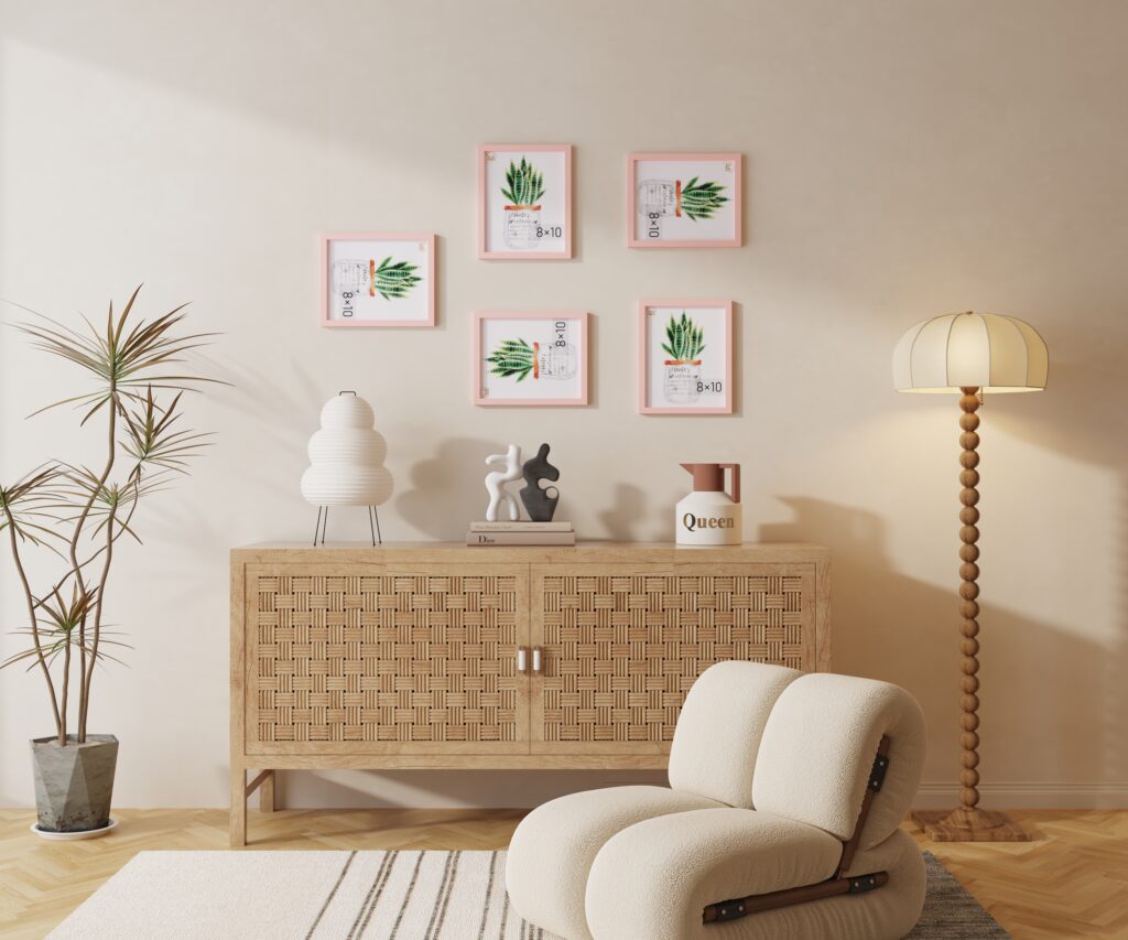 多材质、多风格的墙板与装饰画,为空间增添层次与设计感,提升整体视觉氛围。
